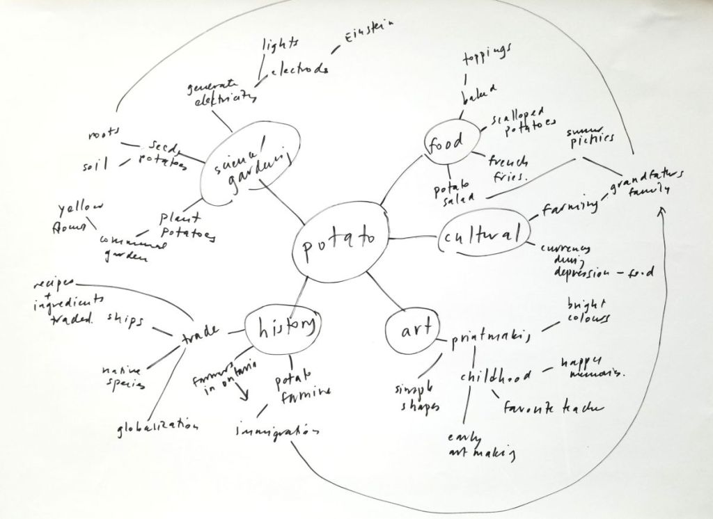 To create a mind map, take a large piece of paper and write your subject in a circle in the centre (see potato above). Draw spokes coming out of the circle, and add words that describes different aspects of the subject. Then, keep going by adding words and ideas associated with the concepts in each spoke. By the time you get further out in your mapping, your mind will light up around certain associations and ideas. These ideas may be rooted in memories, stories, feelings or subject areas that spur further exploration. They are the golden nuggets to focus on as your work takes shape.