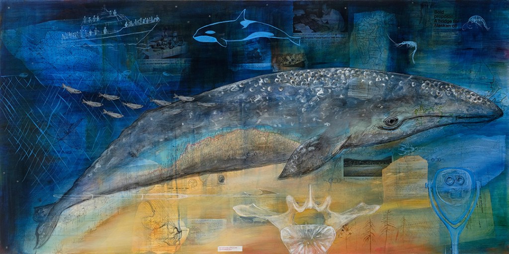Once I had the ideas down, I could then visualize the elements I wanted to include in the painting—a map of the west coast of North America, references to the whale’s food web, Indigenous connections to grey whales, and threats to the whales from industry and human activity. The final painting almost looks like a mind map too!